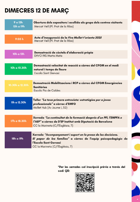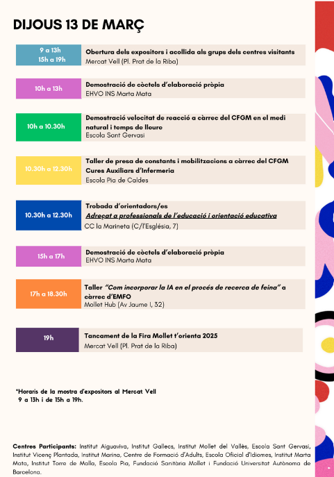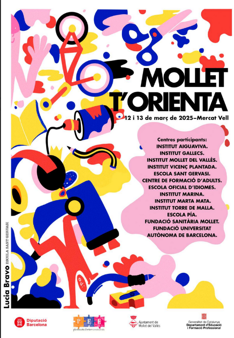 Dimecres i dijous d’aquesta setmana, 12 i 13 de març, tindrà lloc la Fira educativa “MOLLET T’ORIENTA” per donar a conèixer l’oferta acadèmica postobligatòria dels diferents centres educatius de Mollet del Vallès i les sortides professionals que hi ha al nostre territori.