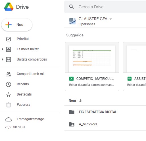 El centre organitza  la documentació corresponent a cada curs en una unitat compartida. Aquesta unitat es comparteixen exclusivament amb els docents; , de tal manera que en tot moment es controla qui té accés a la informació, tant com a lector com a editor. En aquesta carpeta hi ha tota la informació que necessita el personal del centre: des de la documentació oficial (PEC, NOFC, projecte de direcció, actes de claustre i consell escolar, etc), passant per llistes d’alumnes matriculats, llistats d’assistència, control d’altes i baixes, registres de sortides i activitats extraescolars… fins el recull del desenvolupament dels diferents i programes i duu a terme el centre.