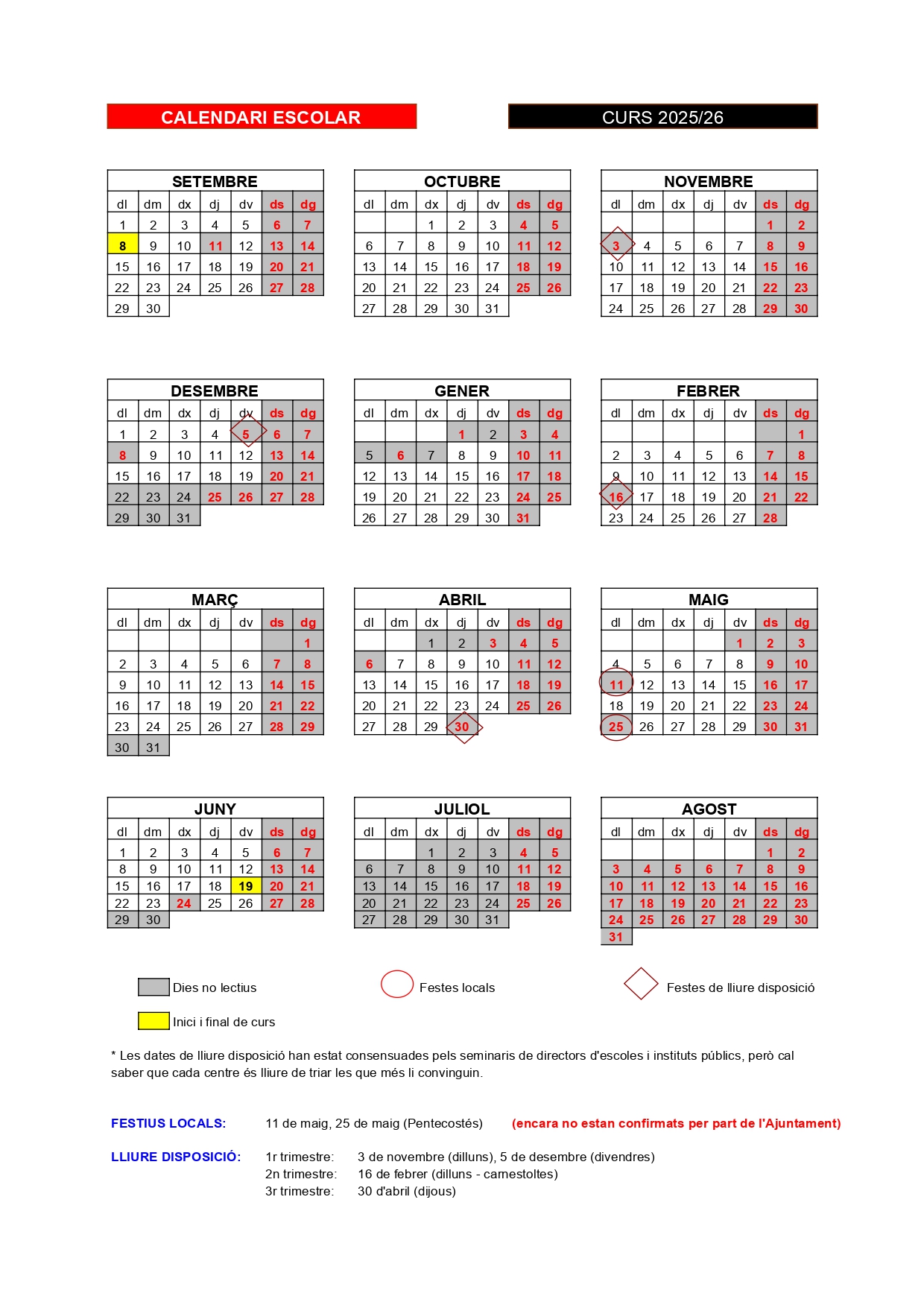 Inici de curs i final de curs: dijous 25 de setembre de 2025 – divendres 19 de juny de 2026