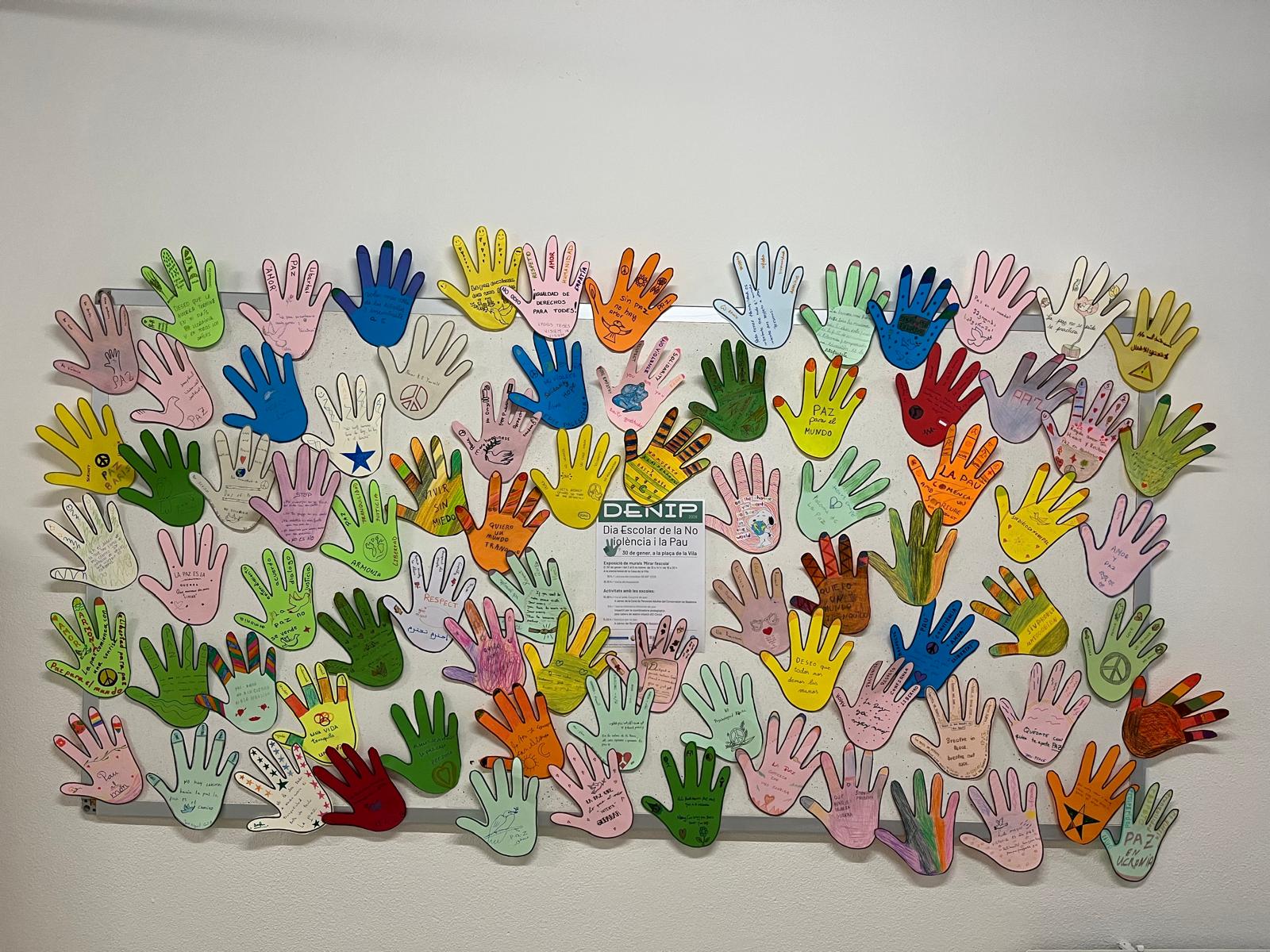 Com es pot veure a la fotografia, els i les alumnes creen un mural commemoratiu que omplen amb siluetes de mans. Cada mà recull missatges, desitjos i frases inspiradores en favor de la pau i la resolució pacífica de conflictes. Aquesta acció simbòlica serveis per visualitzar el compromís de la nostra comunitat educativa amb un món més just i respectuós.