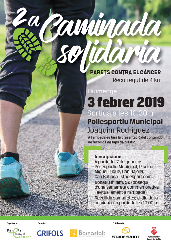 El diumenge 3 de febrer de 2019 a les 10.30 h al pavelló municipal Joaquim Rodríguez, se celebrarà la segona edició de la caminada Parets contra el Càncer, enguany el recorregut serà de 4 km.