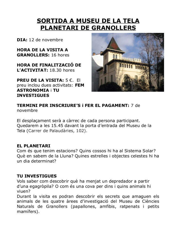 Visita al museu de la tela i el planetari el 12 de novembrePer cfaparets / 29/10/2019 / General Portada / Sortides