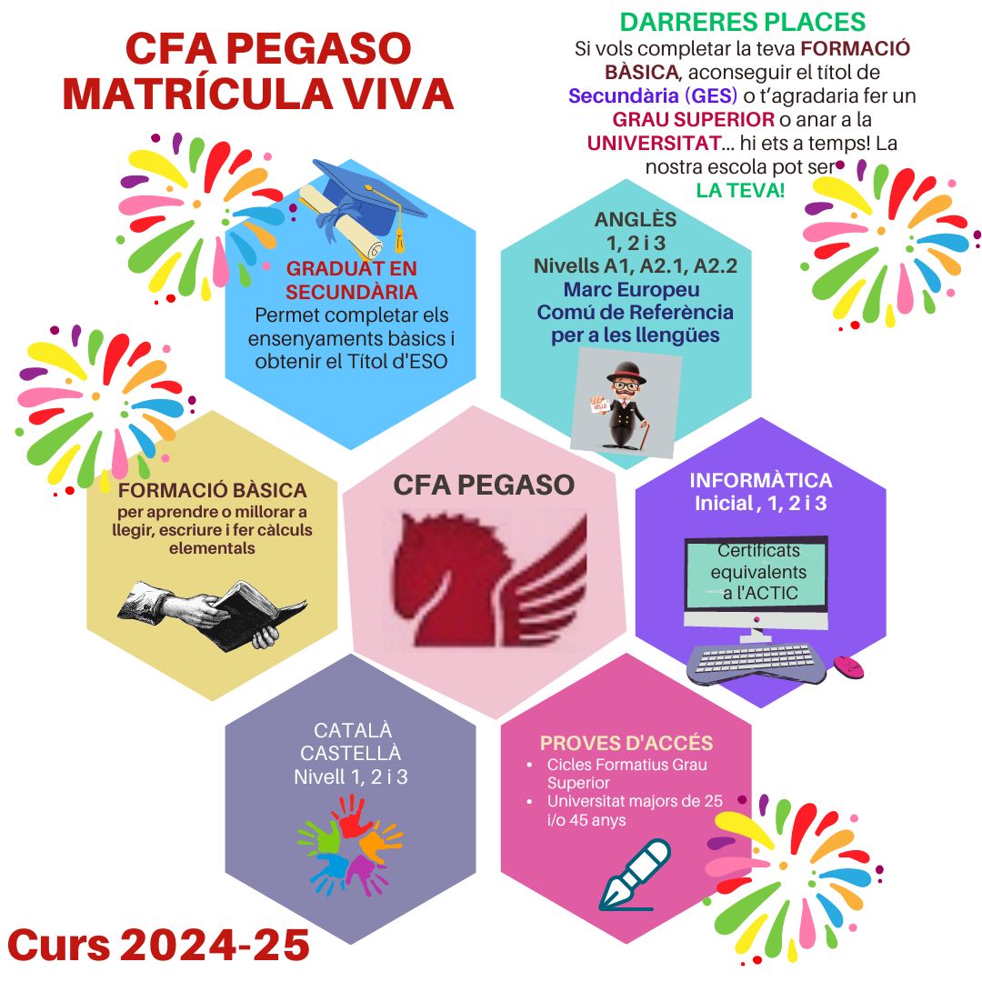 Contacta’ns via telèfon (933 464 362) o mail (escoladults@cfapegaso.cat) o vine a veure’ns (de dilluns a divendres de 10h a 13h, de dimarts a dijous de 17h a 20h)