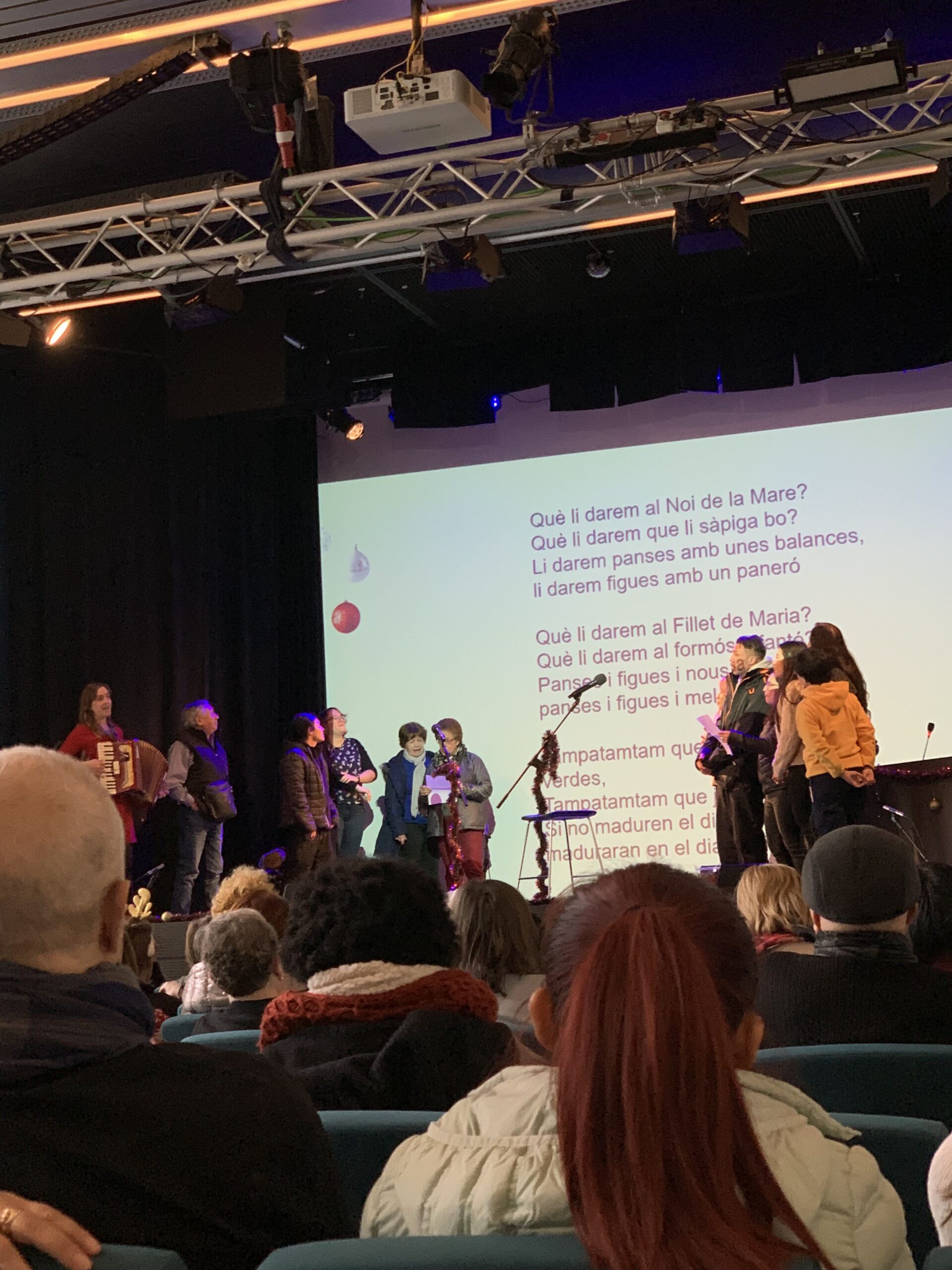 Les presentadores de la festa han estat la Muntsa Moral i la Bea Lores. En aquesta festa, hem pogut veure el pessebre vivent de l’alumnat d’Anglès 1, l’actuació de la Muntsa Moral i la interpretació del “Noi de la mare” per part l’alumnat de Català 1. També, les emocionants paraules d’Antonia García, representat de l’alumnat al Consell Escolar.