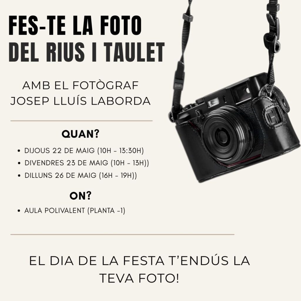 FES-TE LA FOTO DEL RIUS I TAULET practiques121/05/25 AQUEST ANY FORMAREM LA PARAULA: “GRÀCIES”HorariDIJOUS 22 DE MAIG (10H-13:30H)DIVENDRES 23 DE MAIG (10H-13H)DILLUNS 26 DE MAIG (16H-19H)