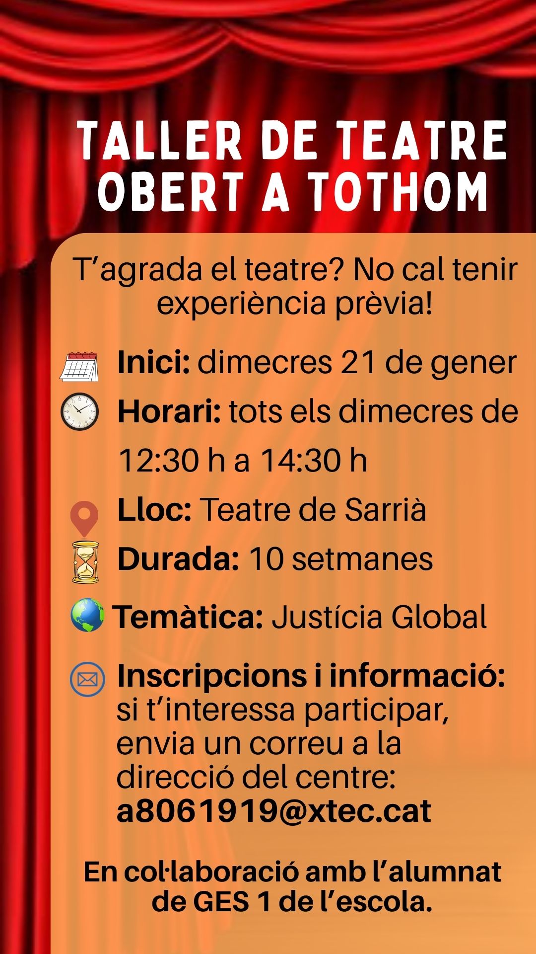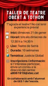 Els convidem a participar d’aquest taller de Teatre que començarà la setmana vinent, el 21 de gener. És una activitat que no requereix experiència prèvia i treballarà la temàtica de la justícia global 💪🌍
