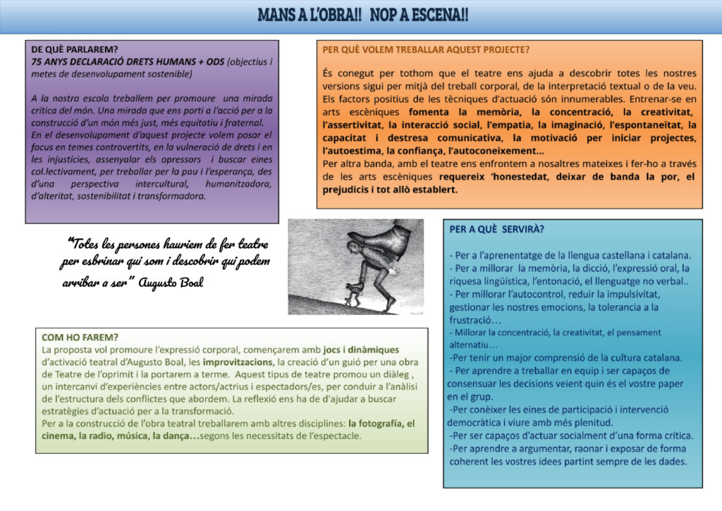 El repte era treballar amb el concepte de Teatre de l’Oprimit i el Teatre Foro de l’Augusto Boal, dramaturg, escriptor i director de teatre brasiler que va establir un mètode teòric-pràctic per a l’ús del teatre com a eina de transformació social.