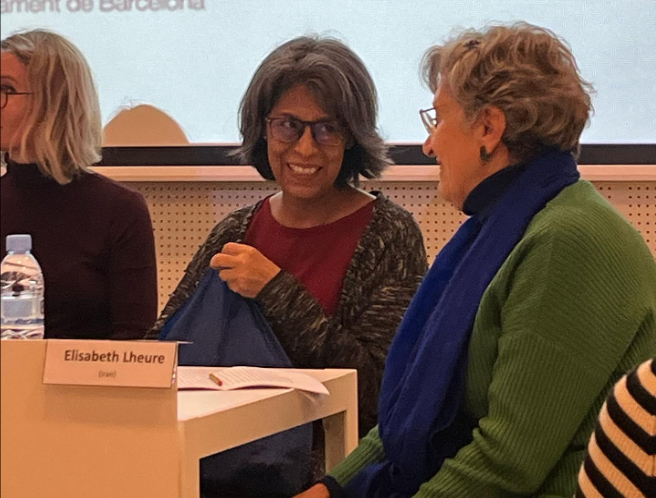 L’Elisabeth Lheure, membre de la comunitat Bahaí de Barcelona, va insistir en la capacitat que té la violència masclista en transfugar en diferents aparells ideològics i comunitats com la bahaí que, tot i haver estat subalternitzades en estats com l’Iran, es regeixen per lògiques patriarcals molt rígides. De procedència iraniana també, la nostra alumna l’Azin Dehdezi ens va parlar de l’onada de protestes massives que ha esclatat arran de la mort de Mahsa Amini, la jove de 22 anys que va morir a mans de la policia quan era detinguda per dur el vel mal posat. L’Azin va destacar la col·lectivitat d’aquestes revoltes: homes i dones estan unint forces per protestar i lluitar contra la repressió que pateixen les dones arreu del pais. Va ser molt crítica amb la manca de suport internacional, en especial de l’estat espanyol.