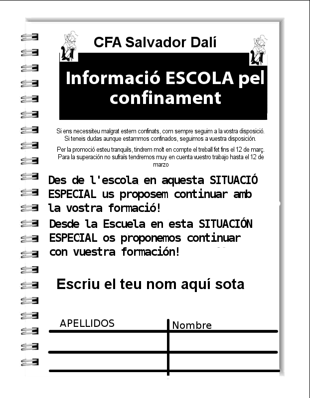 El Claustre del CFA Salvador Dalí ens vam reunir la setmana passada i vam decidir que faríem arribar als nostres alumnes (a través de la cartellera dels mòduls residencials) uns missatges d’ànim degut a la situació excepcional que estan vivint (i que estem vivint tots).