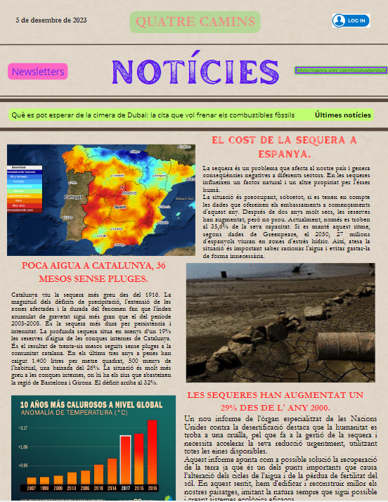 Iniciem el mòdul de Geografia de GES-2 amb les preocupants notícies de la falta d’aigua que estem vivint a tot el país. Cada dia els mitjans de comunicació fan referència a la situació de sequera  que assetja tot el territori català, però també els desastres ambientals que està causant a escala mundial. Podem llegir moltes notícies que ens informen que la manca d’aigua està posant en perill l’existència dels homes a la terra. Si les informacions són certes, en un futur molt proper, no tindrem suficient aigua per a tots els habitants de la terra. Com a conseqüència del canvi climàtic, cada cop plou menys i fa més calor a Catalunya, a Espanya i a tot el món. Així a l’aula de secundària ens hem informat d’aquesta greu situació i hem volgut crear el nostre propi diari per estar ben informats.  Podeu llegir la portada amb els titulars i les últimes notícies de més actualitat. A continuació les dues portades més destacades del dia, la primera del diari Notícies i la segona del News