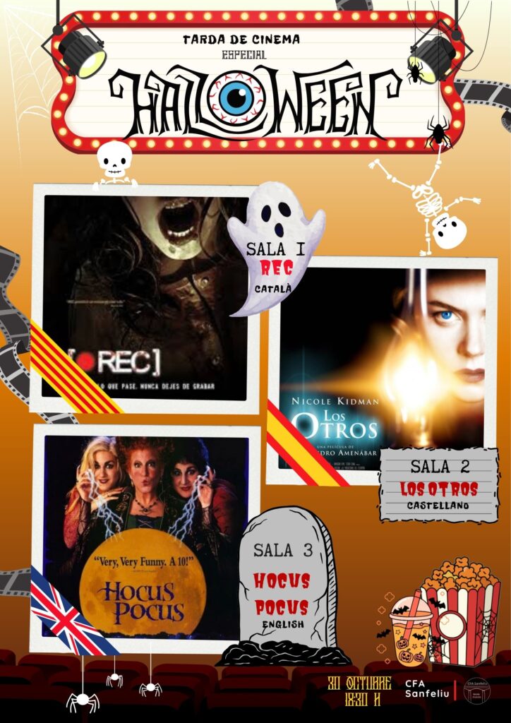 • A les 18:30h muntarem una sessió de cinema de terror amb 3 pel·lícules diferents de cada llengua i subtitulades en cada llengua. Una en català, una altra en castellà i la tercera en anglès.