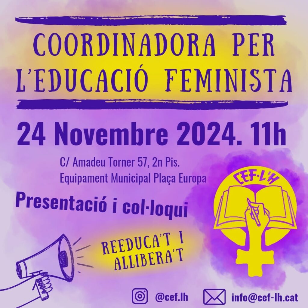 Aquesta entitat la conformen famílies de diferents AFA i professionals de l’àmbit educatiu, que ja fa uns anys que ens formem i treballem conjuntament per a preparar materials d’assessorament per totes les entitats educatives del municipi. CEF-LH (Coordinadora per l’Educació Feminista) preten poder oferir l’experiència i formació de les persones que la formen, per assolir que les dones deixin de rebre violència pel fet d’haver nescut dones.