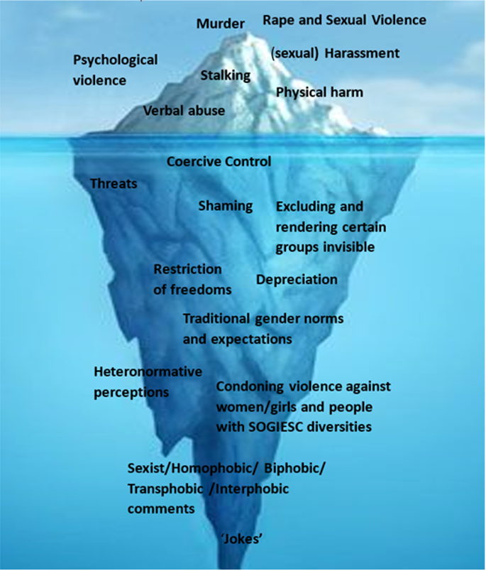 Taking a look at the picture of the iceberg below, we can see that while it is easier for us to recognize the more overt manifestations of violence such as murder, rape, sexual violence, physical abuse and verbal abuse, we often remain oblivious to the hurtful impact of the more covert manifestations of violence. Derogatory language or jokes, practices that render certain groups invisible, shaming, isolation and exclusion, among others, are practices that lay at the bottom of the iceberg, because they are not easily recognized as hurtful, racist and abusive. However, it is these practices that constitute an overall climate of disrespect of diversity and human rights violations and give rise to all the behaviours that lie at the visible part of the iceberg. Such behaviours, when put together as different parts of a puzzle over time, synthesize a vivid, powerful and coherent picture, that of sexism, homophobia, transphobia, biphobia, interphobia and gender-based and sexual violence in all its forms.