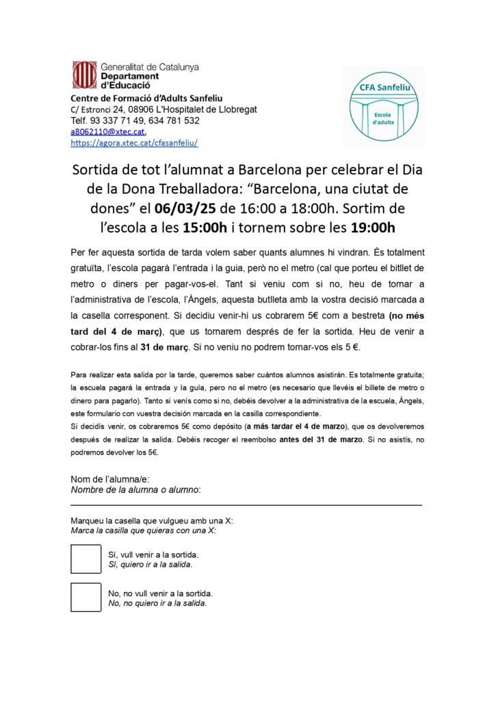 Sortida de tot l’alumnat a Barcelona per celebrar el Dia de la Dona Treballadora: “Barcelona, una ciutat de dones” el 06/03/25 de 16:00 a 18:00h. Sortim de l’escola a les 15:00h i tornem sobre les 19:00h
