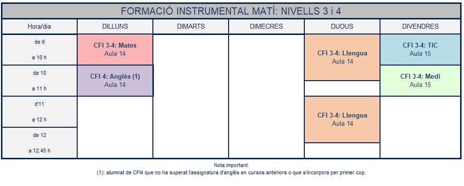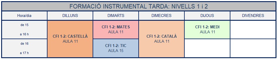 - INSTRUMENTAL 2 (TERCER I QUART NIVELL): ampliació dels coneixements dels dos nivells anteriors i assoliment dels objectius generals del cicle.