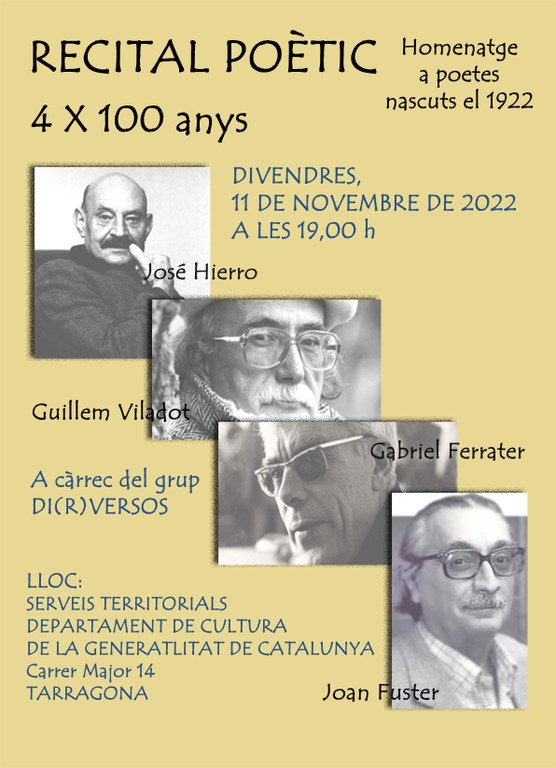Els quatre poetes que han protagonitzat aquest homenatge i que enguany arribarien als cent anys són el reusenc Gabriel Ferrater (durant aquest any Catalunya celebra l’Any Ferrater), José Hierro (la Fundación José Hierro en commemora el centenari), Guillem Viladot (també es commemora el 2022 l’Any Viladot) i el poeta de Sueca Joan Fuster (del qual la Generalitat també organitza una programació d’homenatge a través de l’Any Fuster).