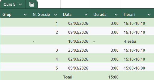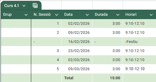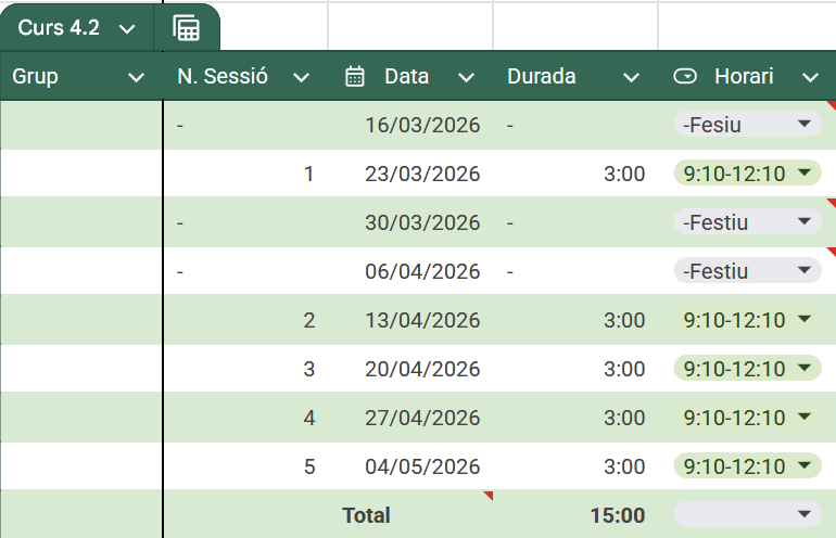Curs 4. Digitalització aplicada a l’entorn professionalAquest curs consta de dos mòduls: gestió de dispositius i dades mitjançant tecnologies habilitadores digitals i gestió de continguts mitjançant tecnologies habilitadores digitals Durada: 30 hores (2 mòduls formatius de 15 hores) (Dilluns matí, de les 9:10 h a les 12.10 h)