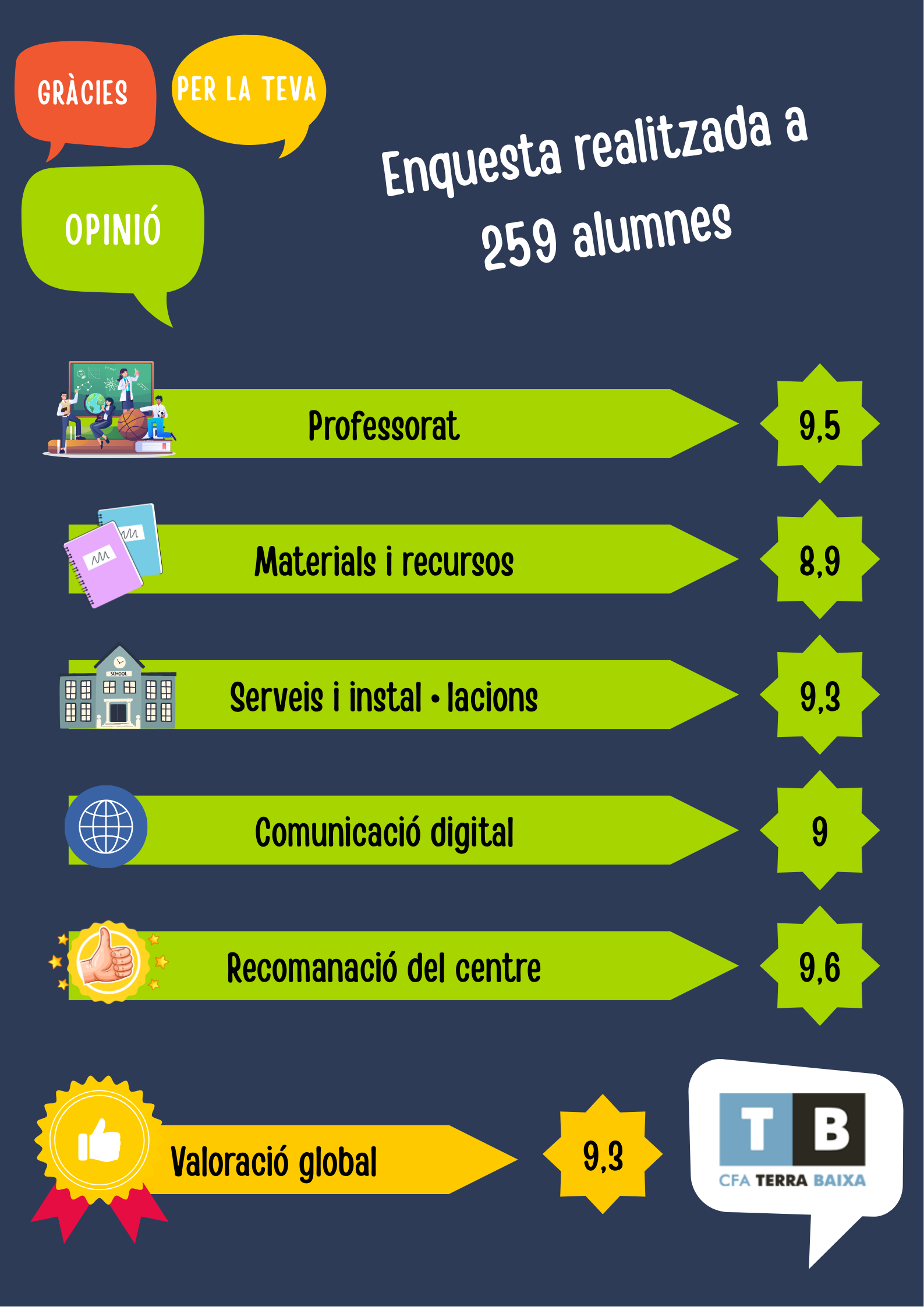 Uns resultats com aquests són una mostra de confiança que valorem profundament, i que ens motiven a seguir millorant dia a dia. Continuarem treballant amb il·lusió i responsabilitat per seguir oferint un servei educatiu de qualitat, al vostre costat.