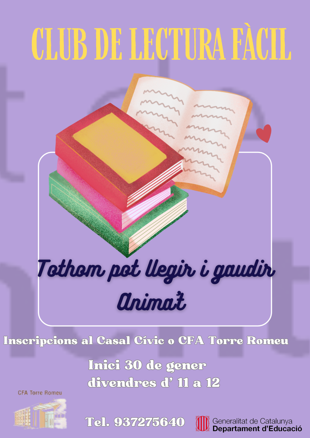 Inscripcions al Casal Cívic o al CFA Torre Romeu. Inici el 30 de gener d’11 a 12.