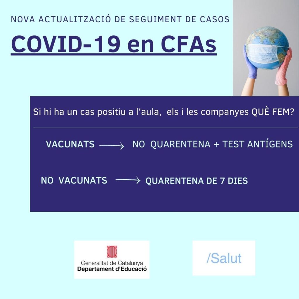 El departament d’educació ha enviat l’actualització del protocol de seguiment de casos COVID-19 als centres educatius. En els Centres de Formació d’Adults la normativa actual és la següent: Si hi ha un cas positiu a l’aula, l’alumnat i el professorat que han sigut contacte estret hauran de: NO FER QUARENTENA I FER UN TEST D’ANTÍGENS […]
