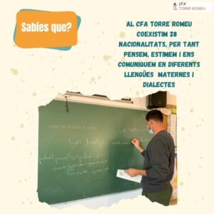 Al CFA Torre Romeu coexisteixen 28 nacionalitats diferents: Espanya, Marroc, Mali, Ghana, Brasil, Geòrgia, Romania, Índia, Gàmbia, Burkina Faso, Afganistan, Pakistan, Vietnam, Guinea, Mauritània, Libèria, Senegal, Algèria, Síria, Palestina, Bolívia, Perú, Nigèria, Colòmbia, Hondures, Kazakhstan, Veneçuela i Bielorússia. Per tant, cada dia escoltem cada dia una ampla diversitat de llengües i dialectes als corredors i aules.