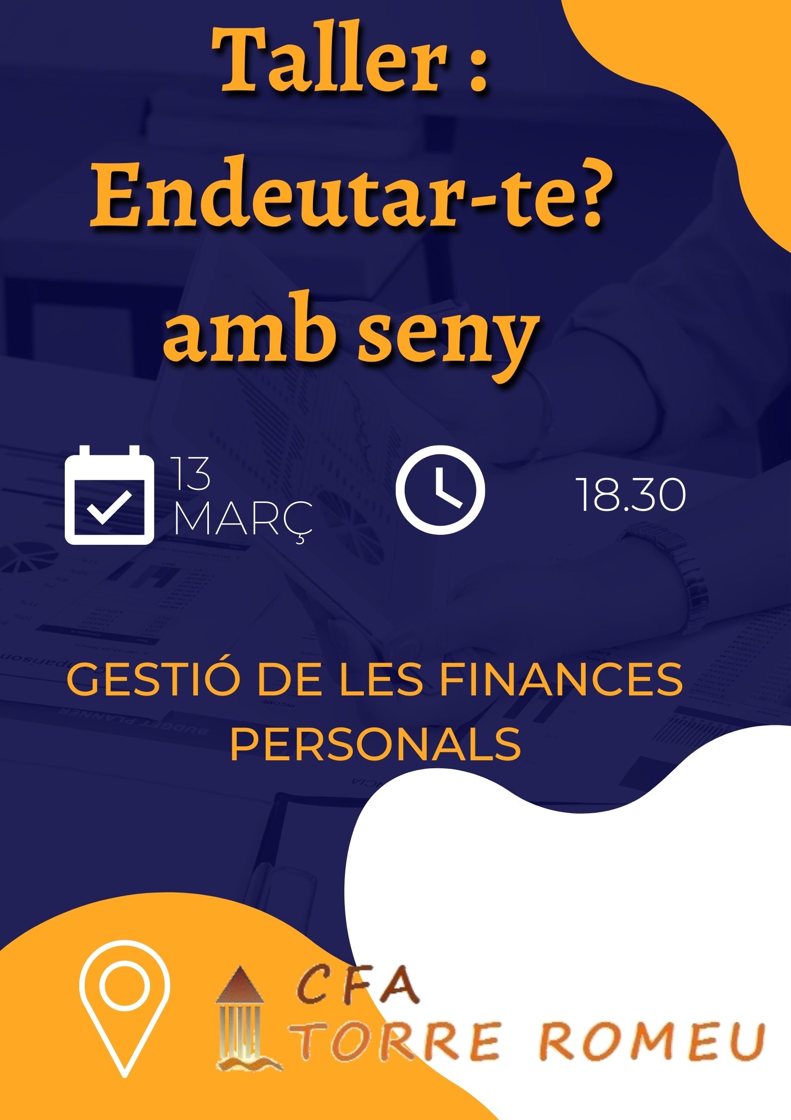 Taller : Endeutar-te, amb seny Feu un comentari / Per admin / 08/02/2023 / Portada Tallers Tornem a fer un altre taller d’economia a l’escola. El dia 13 de març a les 18.30. Aquesta vegada ens parlaran de : “Endeutar-te, amb seny”