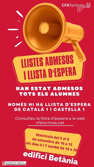 | Llista d’admesos | Heu de venir a confirmar la matrícula del 5 al 8 de setembre. |