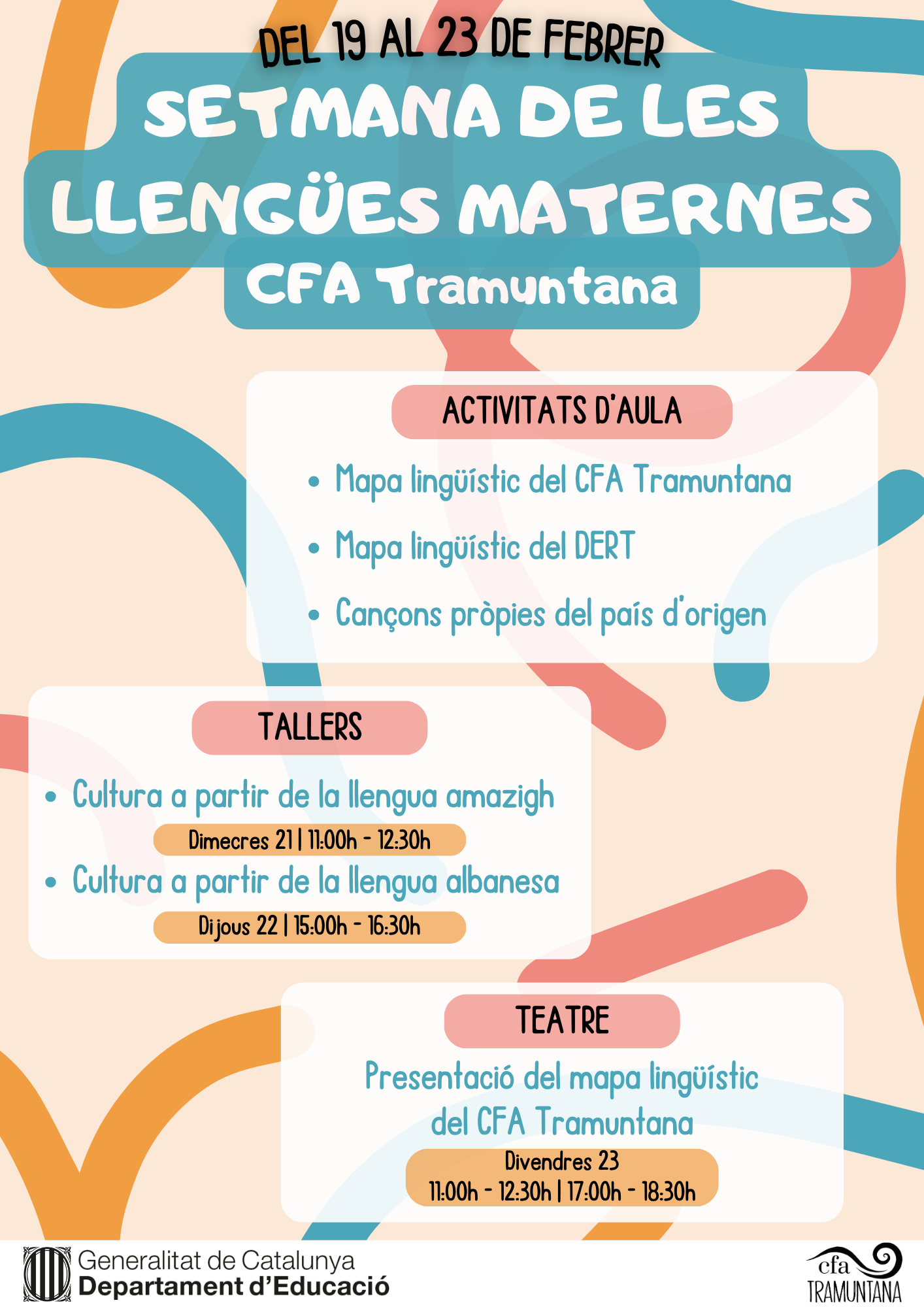 La propera setmana, del dilluns 19 al divendres 23 de febrer, al CFA Tramuntana celebrem la setmana de les llengües maternes. Per fer-ho, enguany realitzarem un mapa lingüístic virtual on l’alumnat podrà penjar les seves llengües maternes i el seu lloc d’origen. A més, aquest mapa permetrà que qui vulgui pugui gravar-se cantant una cançó típica del seu lloc d’origen i penjar-ho en línia. Així, el divendres farem una trobada al teatre en què presentarem aquest mapa virtual. A part d’aquesta activitat, hi haurà un taller de llengua i cultura amazigh i un altre d’albanès desenvolupat per l’alumnat de l’escola. Aprofitem l’entrada per deixar penjat el cartell amb totes les activitats i una vegada transcorreguda la setmana farem una altra publicació amb les imatges i també l’enllaç al mapa virtual.