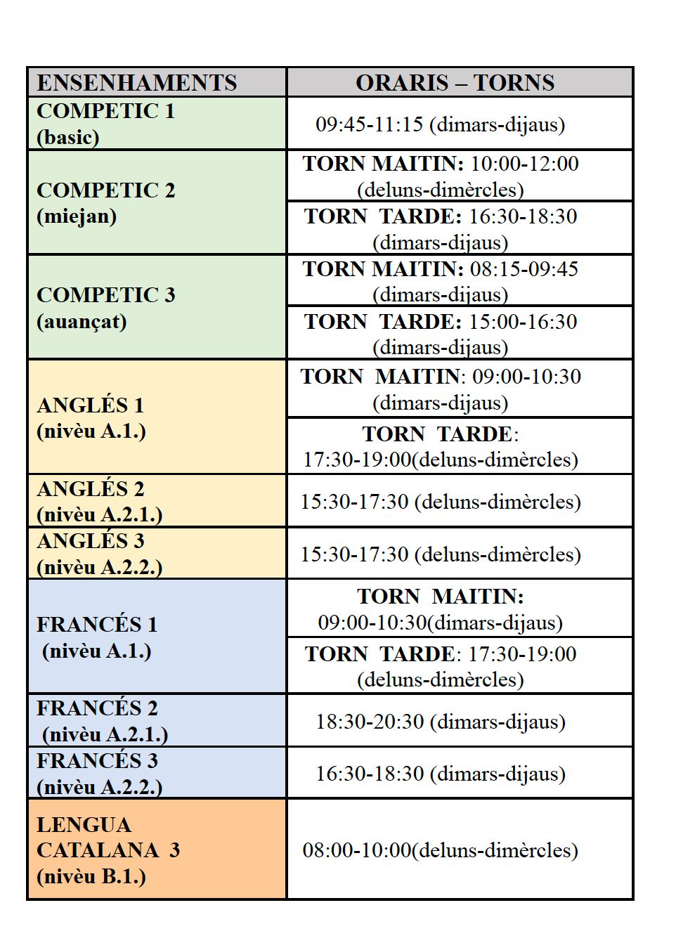 Començam!! admin16/09/22 Eth pròplèu deluns dia 19 iniciam es classes en CFA Val d’Aran: Vos rebrembam es oraris: