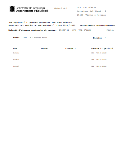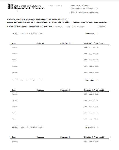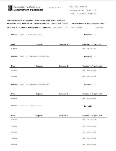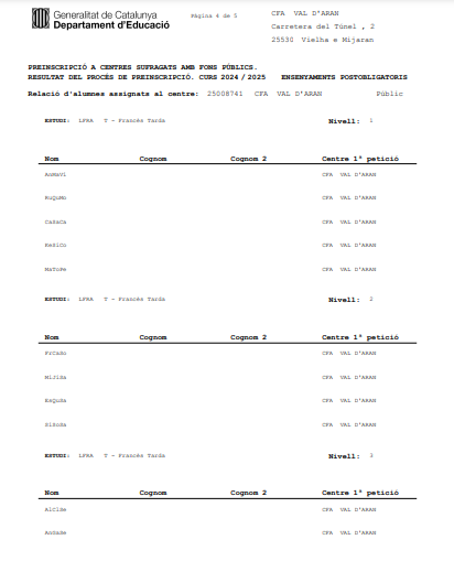 Aciu vos deisham eth listrat deth nau alumnat preinscrit entath pròpleù cors. Era matricola entàs naui inscrits e tot er alumnat deth cors 2023 2024 qu’a reservat plaça entath pròplèu cors serà deth 4-9 de seteme de 2024. A compdar deth dia 10 se daurirà era matricola des listrats de demora de plaça. |