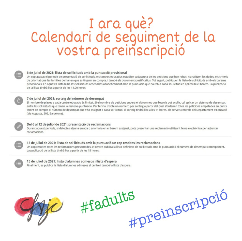 Un cop acabat el termini de presentació de sol·licituds de preinscripció als centres de formació de persones adultes, es posa en marxa el sistema d’assignació de places. El calendari d’aquest procediment és el següent: 6 de juliol: llistes provisionals de sol·licituds. Cada centre publicarà les llistes anonimitzades de totes les sol·licituds rebudes. Atenció: la publicació de