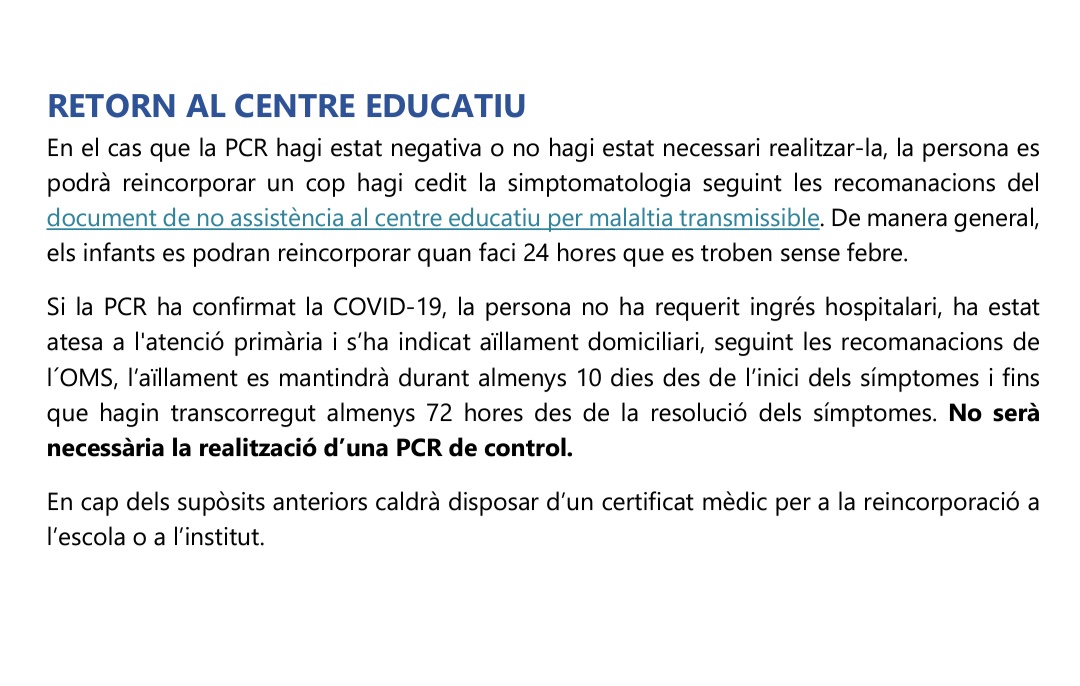 FONT : Protocol de gestió de casos Covid19 en els centres educatius, versió 9 de setembre de 2020. Departament d’Educació.