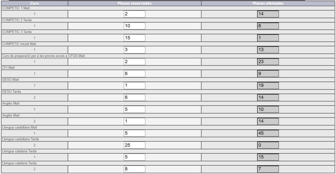 A continuació podeu trobar el resum de places reservades i ofertes (lliures) per al curs 25-26.