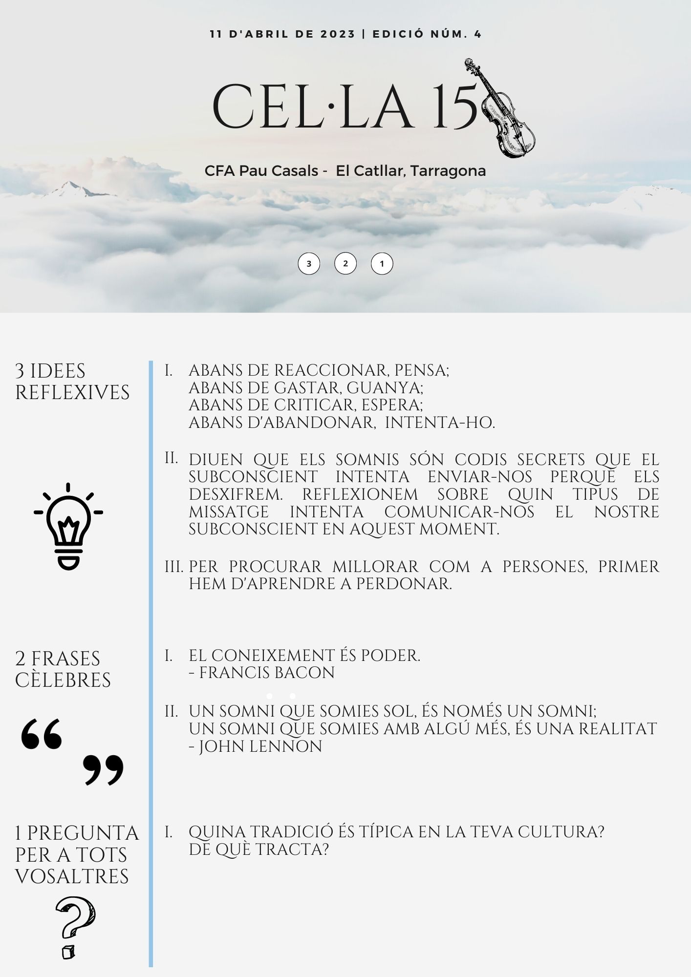 Aquí trobareu el butlletí “Cel·la 15”. Un butlletí ocasional pensat per l’alumnat del CFA Pau Casals que conté: