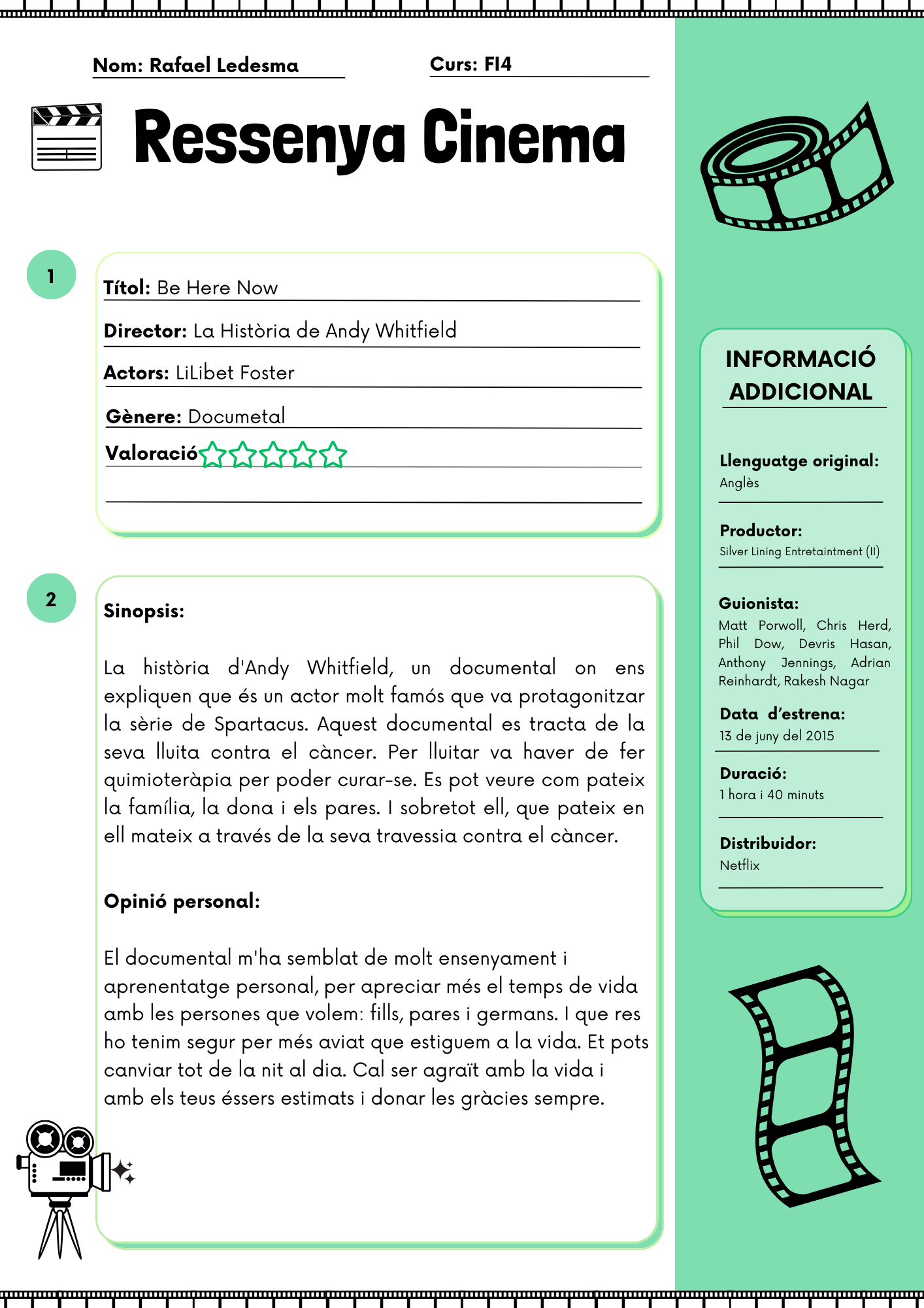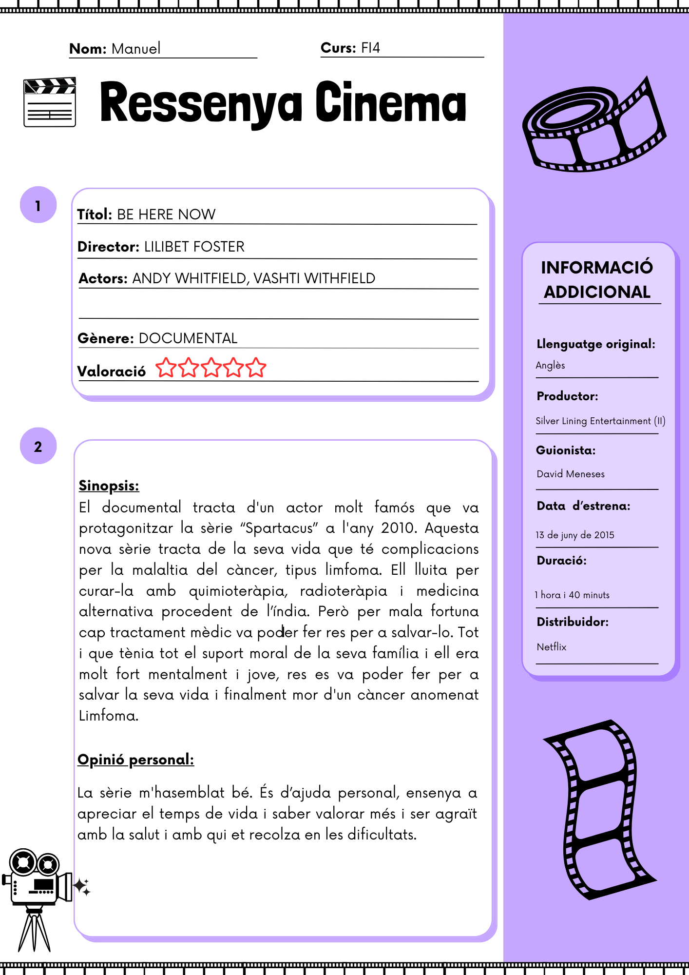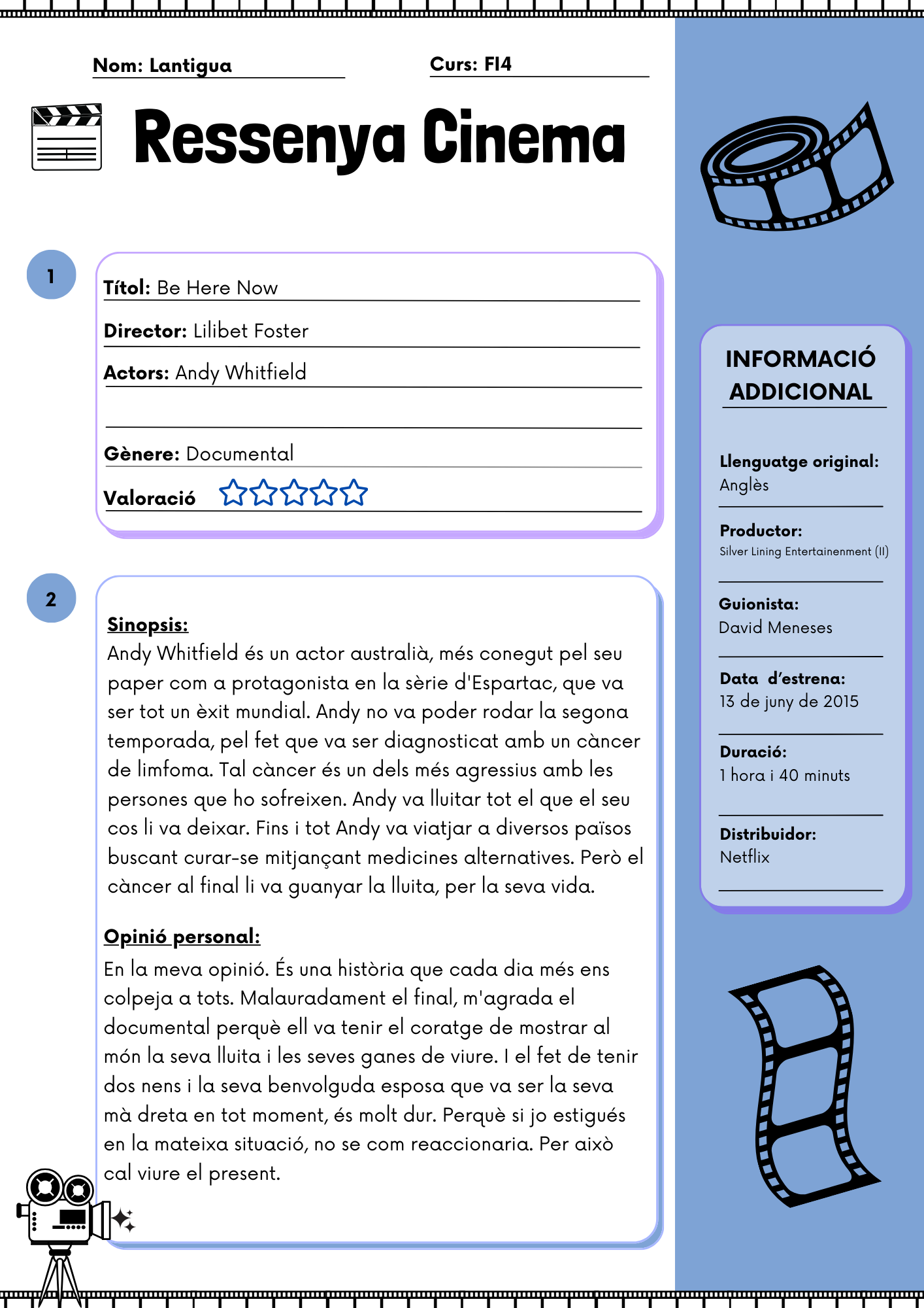 Els alumnes de FI4 han realitzat una ressenya sobre el documental Be Here Now, que explica la història d’Andy Whitfield i la seva lluita contra el limfoma. Després de visualitzar el documental, els estudiants han treballat l’estructura narrativa i han elaborat un resum dels esdeveniments principals. A més, han compartit les seves valoracions i opinions personals sobre com els fets relatats els han impactat emocionalment, reflexionant sobre la valentia de Whitfield i la importància de viure el moment present. Aquest treball els ha permès connectar amb temes universals com la salut, la superació i la vida, enriquint la seva formació tant acadèmica com emocional.