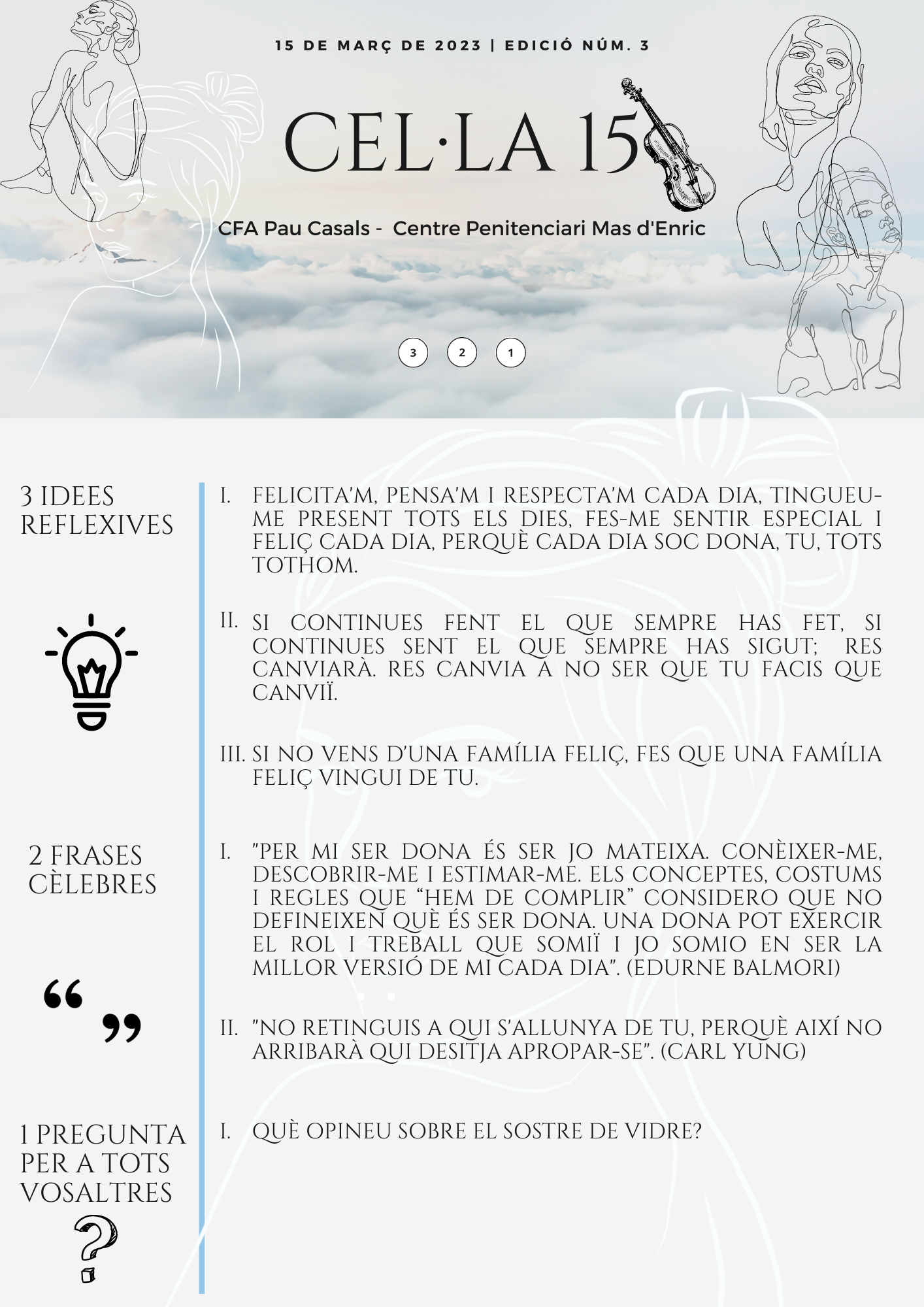 Aquí trobareu el butlletí “Cel·la 15”.  Un butlletí ocasional pensat per l’alumnat del CFA Pau Casals que conté: