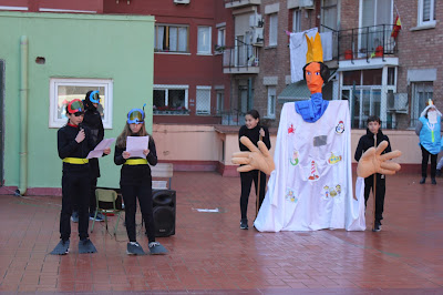 Un nen i una nena de sisè han estat els encarregats de llegir el pregó del carnestoltes i tres més d’acompanyar-lo en el seu passeig pel pati i pel barri.