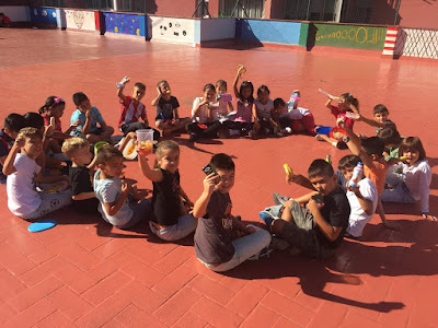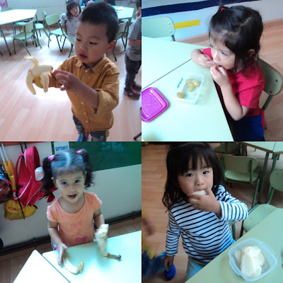 Aquí podeu veure uns quants alumnes gaudint de les vitamines de la fruita.