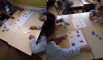 Els nens i nenes de 1r manipulen materials per a treballar nocions matemàtiques d’espai, forma i color.