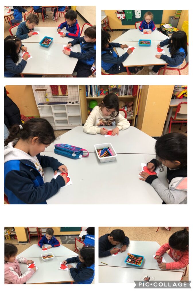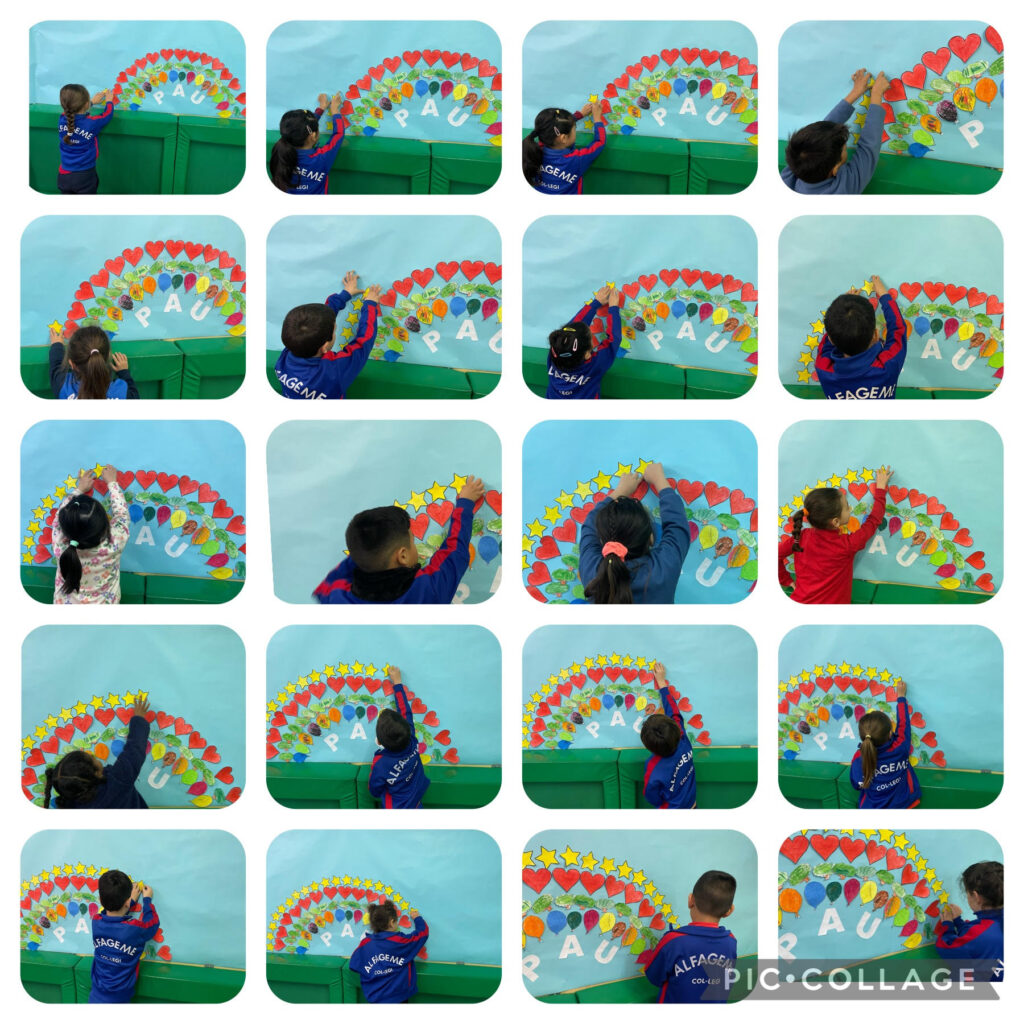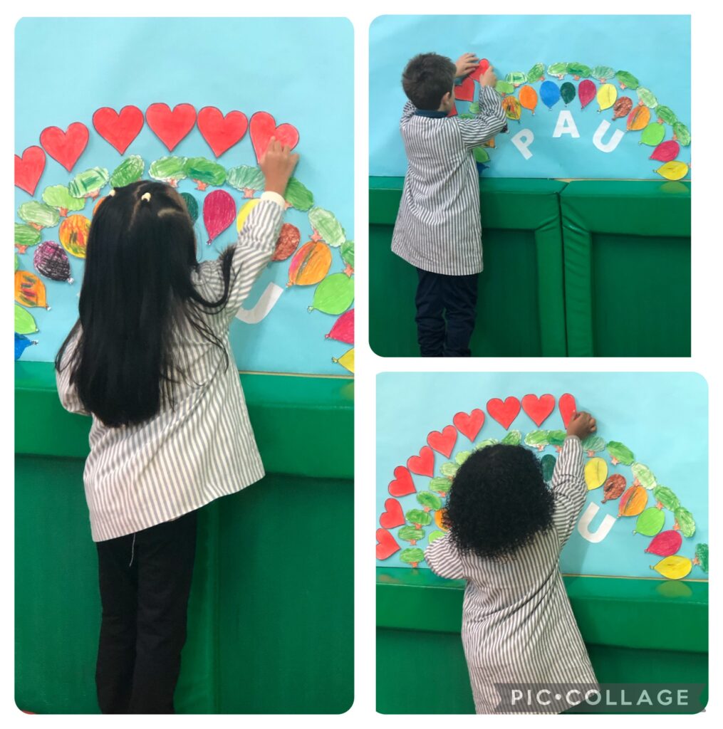 Els nens i les nenes d’I5 han pintat cors de color vermell, per decorar l’arc de sant Martí. A part d’això han après una cançó sobre la PAU, que es diu Un món millor, que han cantat i ballat molt bé.