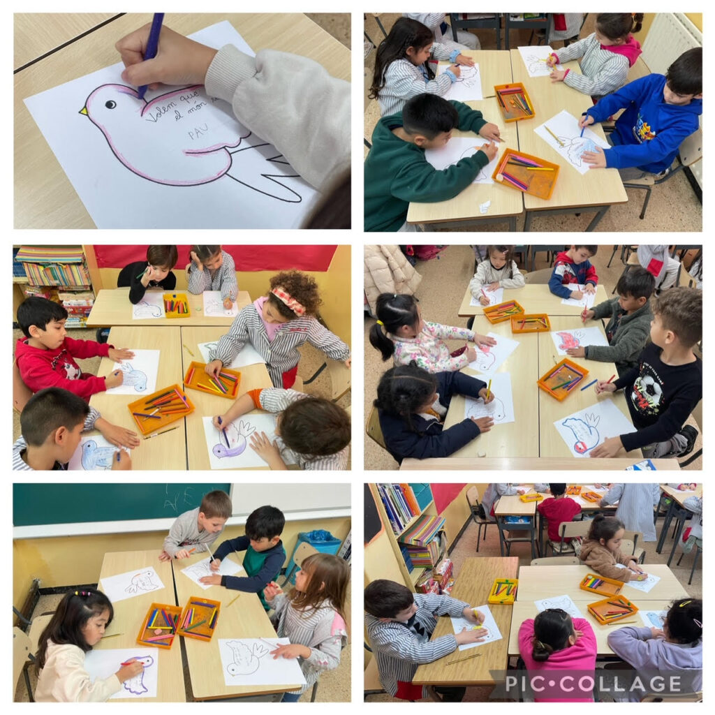 Els nens i nenes d’ I3 han pintat un colom de la Pau i també han pintat uns globus pel mural de la Pau.