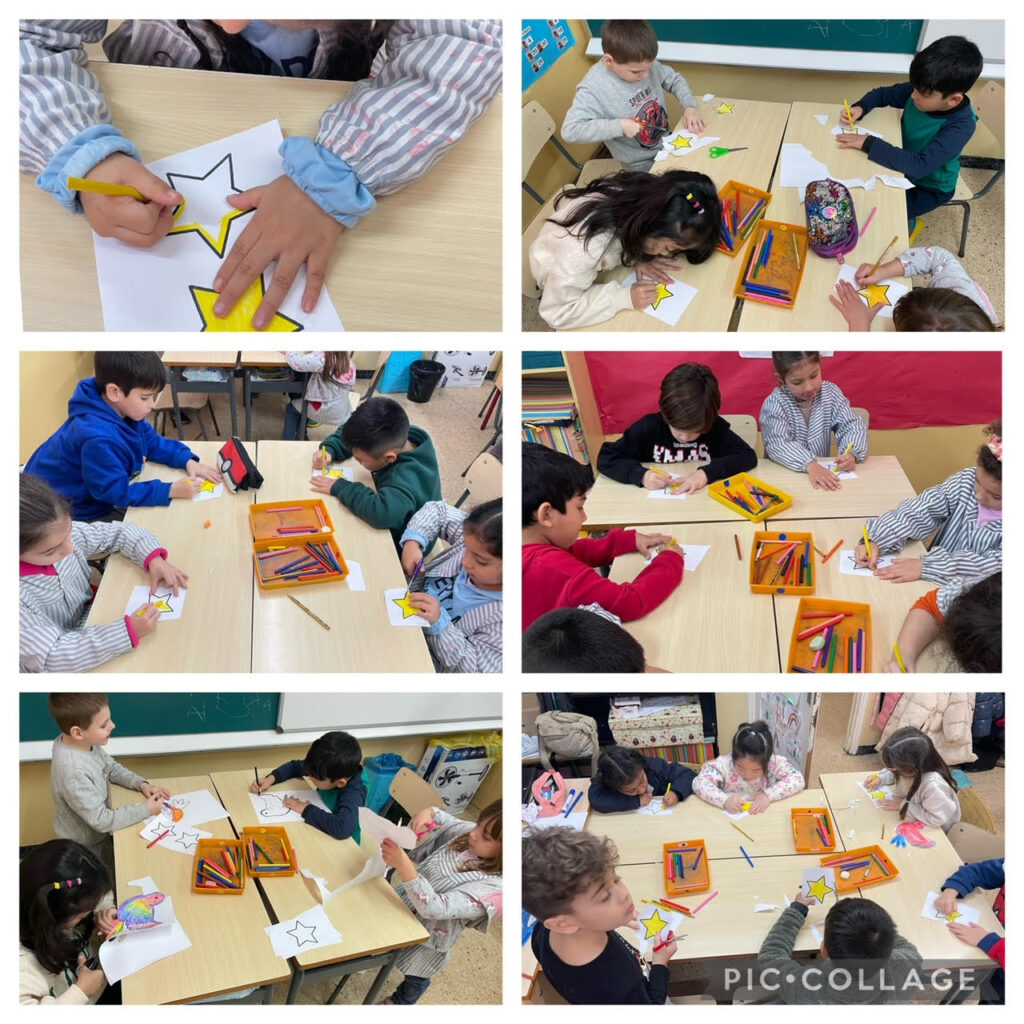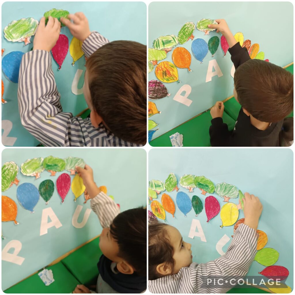 Els nens i nenes de 1r han pintat estrelles grogues i els de 2n unes flors per decorar el mural de l’arc de sant Martí realitzat per tots els alumnes de l’escola. També tot l’alumnat ha completat dins d’un colom de la pau, la frase “Volem que a tot el món regni …” amb paraules relacionades amb la Pau.