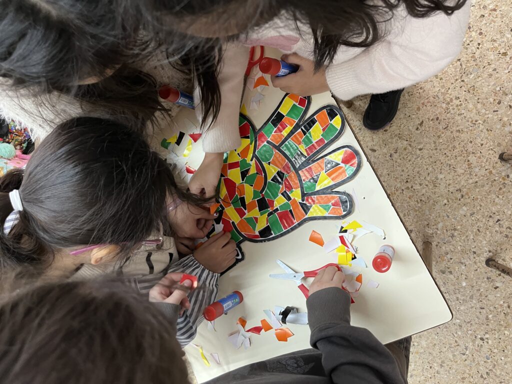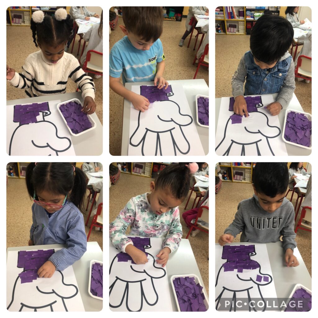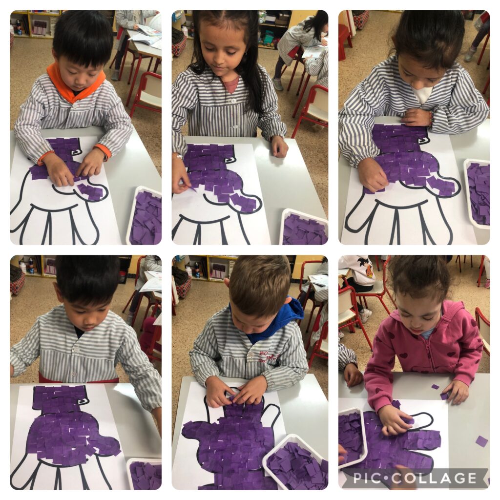 La classe dels elefants han enganxat trossets de paper de seda lila en un mà pel mural que s’ha fet entre tot l’alumnat de l’escola. També han vist uns vídeos de dibuixos animats per nens que ensenyaven com millorar la convivència, com resoldre els conflictes d’una manera pacífica, etc.