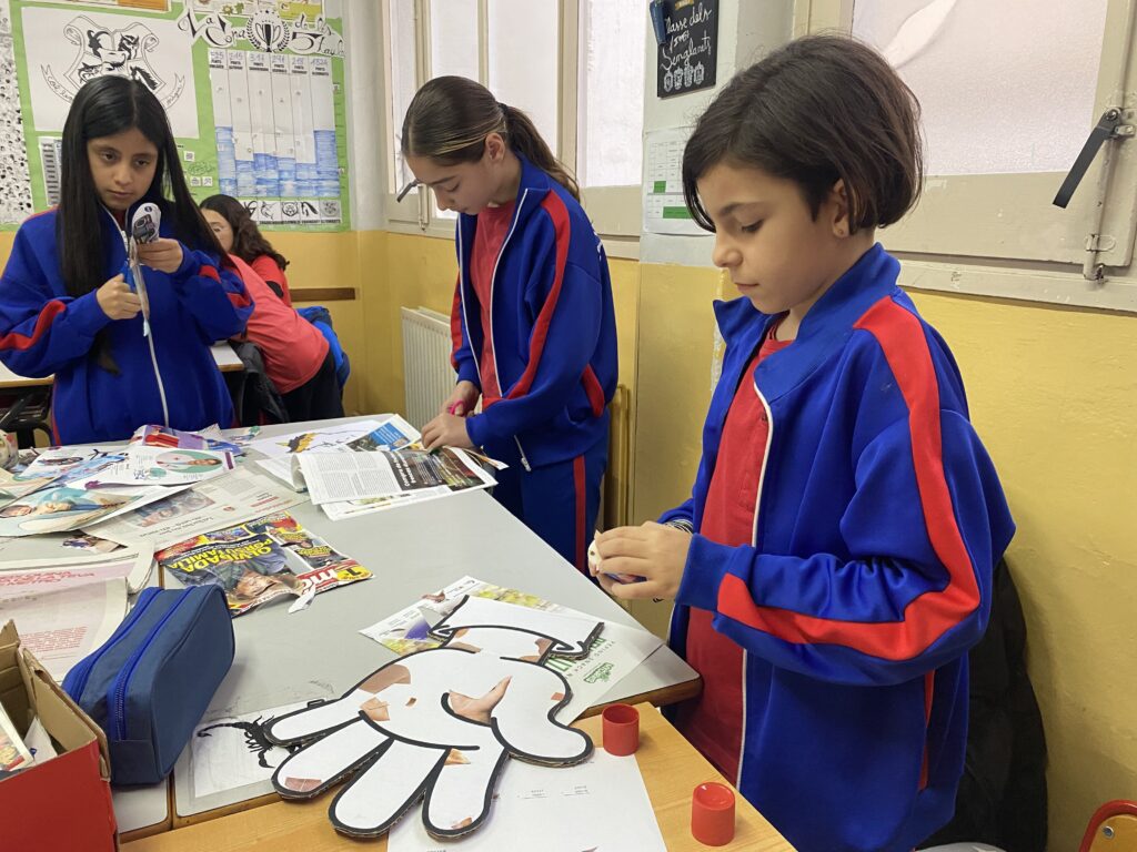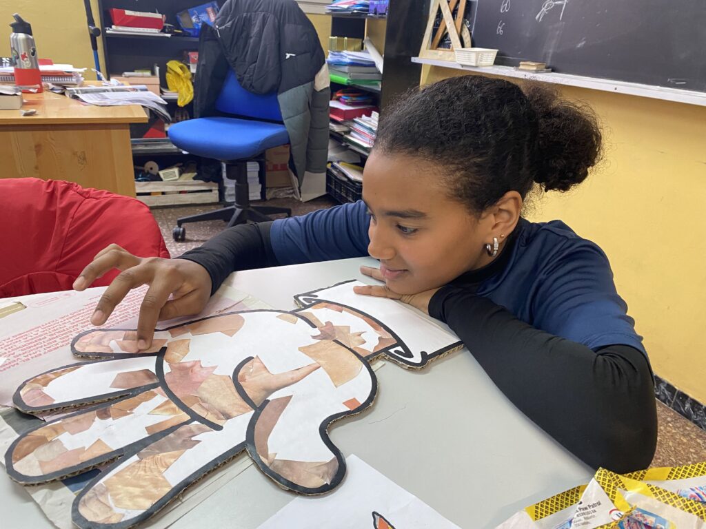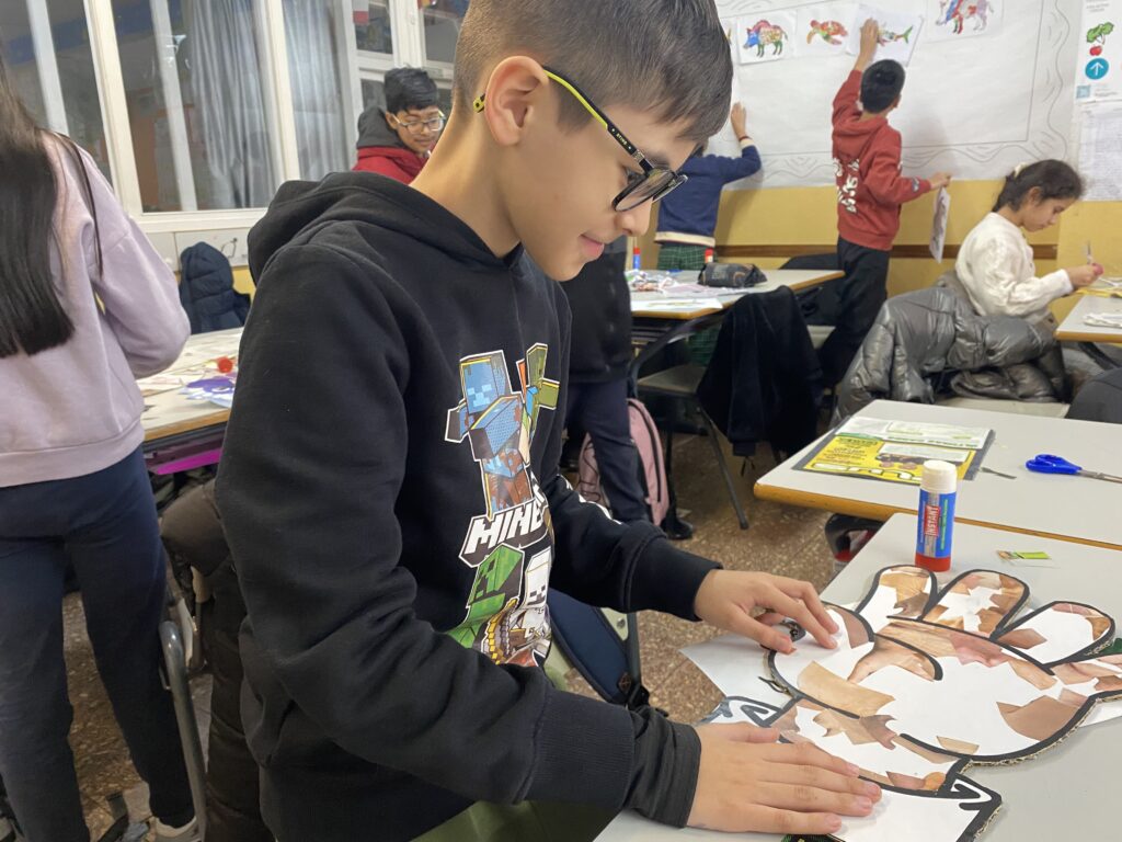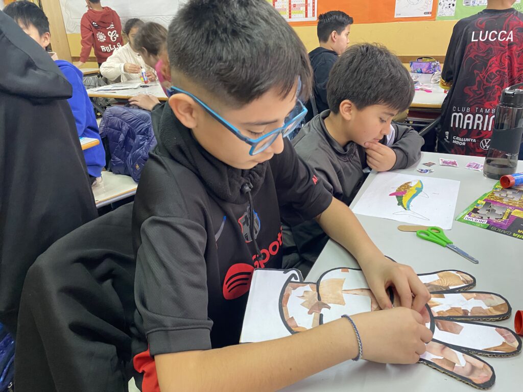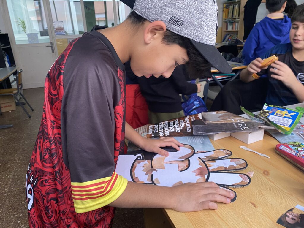 Els i les alumnes de 6è de Primària han reflexionat sobre el respecte cap a les persones indiferentment de cap aspecte diferent a nosaltres. Després, hem estat veient anuncis antics de la televisió espanyola i comentant-los per veure què els semblava. Finalment i seguint el projecte de plàstica, hem aprofitat el tema del trencadís i el collage per fer una mà amb diferents tonalitats de pell que ens anàvem trobant a les revistes.