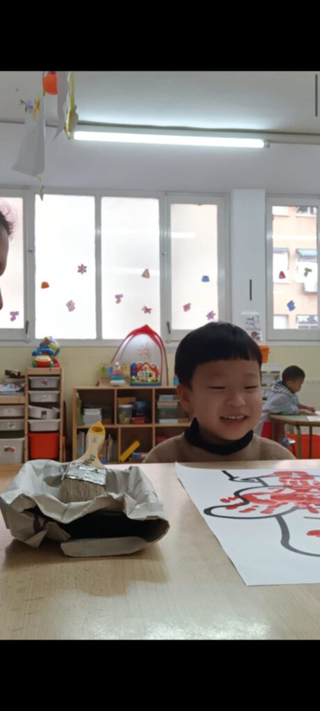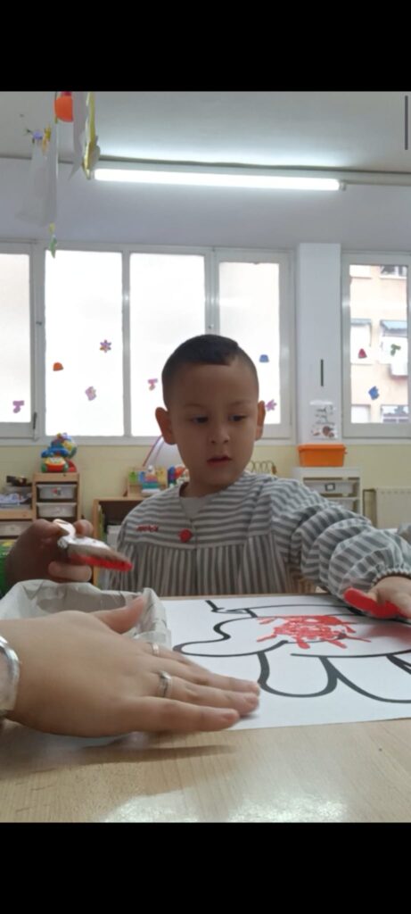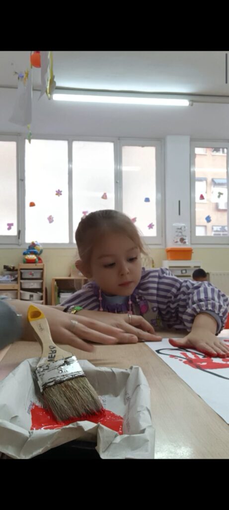 També han pintat una mà molt gran, estampant les seves de color vermell, com activitat conjunta d’escola. Aquí podeu veure el procés i el resultat:
