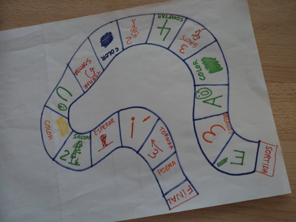 Els nens i les nenes de la classe de les Papallones hem fet una baldufa numèrica. Amb aquesta baldufa, al mateix temps que desenvolupem la capacitat de fer-la rodar, també treballem amb ella poder comptar com si fos un dau. Hem jugat amb un camí on hi hem dibuixat caselles on s´han de fer diferents accions si caus en algunes d´elles. Per exemple: portar coses de color groc o verd, fer quatre salts amb peus junts, girar donant voltes, esperar quatre temps, buscar noms de nens i nenes de la classe que tinguin la lletra A…Guanya la fitxa ( que és un tap d´ampolla ) que arriba abans al final del camí. Els nens i les nenes s´ho han passat molt bé fent les diferents proves i fent girar la baldufa. Se l´han emportat a casa per continuar practicant i jugant amb els pares. Passeu-ho molt bé. A jugar!!!