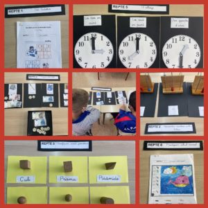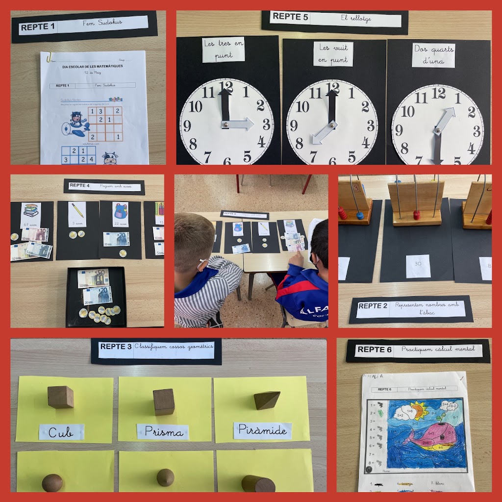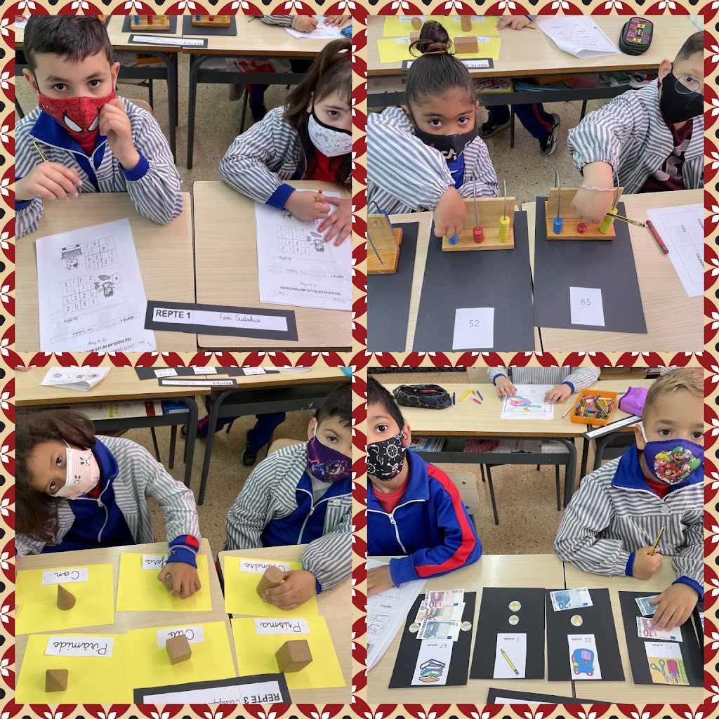 A 1r han celebrat el dia escolar de les Matemàtiques realitzant aquests diferents reptes: fent Sudokus, representant nombres amb l’àbac, classificant cossos geomètrics, pagant amb bitllets i monedes d’euro, posant l’hora en un rellotge analògic i fent càlcul mental.