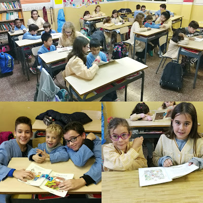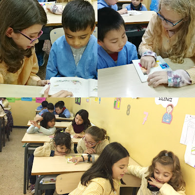 Els nois i noies de 6è i els nens i nenes de 1r han començat a compartir estones junts grà cies a la lectura. Els de 6è fan de padrins lectors als de 1r. Avui ha estat el primer cop que ho han fet i el resultat ha estat satisfactori tant pels grans com per als petits. Aquà teniu una mostra de diferents moments de l’activitat.