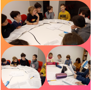 A les classes de Filosofia de 4t de Primària, llegim el llibre d’en Kio i la Gus i, a partir de les seves vivències, relacionem unes idees amb les altres, fem comparacions, treballem el pensament lògic… en definitiva, ens convertim en petits filòsofs un cop a la setmana.