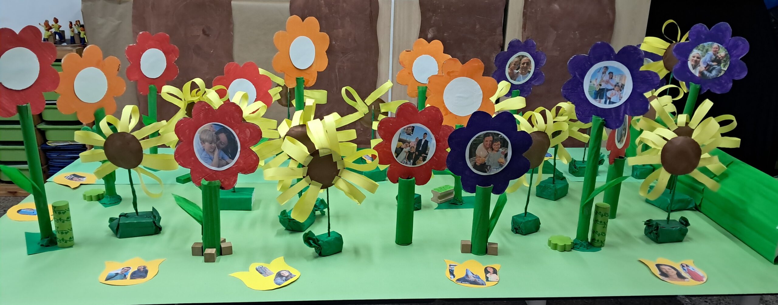 • Fotografies familiars: cada infant ha portat una fotografia seva o de la seva família vinculada a l’escola, amb les quals hem creat un racó floral anomenat : “Les nostres històries”.